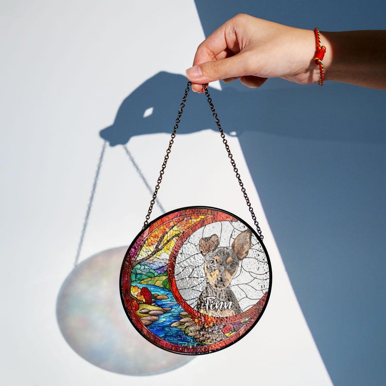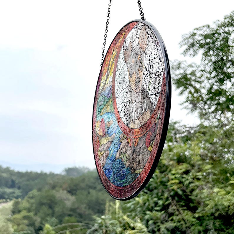 Benefits: The Custom Pet Portrait Suncatcher is more than just art—it's a heartfelt tribute to your beloved pet. It adds a touch of elegance to any home while serving as a beautiful reminder of the bond you shared. The expertly crafted stained glass allows light to filter through, casting a mesmerizing array of colors and enhancing the ambiance of any room. Versatile in its use, it can be displayed in a window to catch the sunlight or hung on a wall as a stunning decorative piece. This suncatcher also makes a thoughtful gift for any pet lover, helping them keep the memory of their cherished companion close.