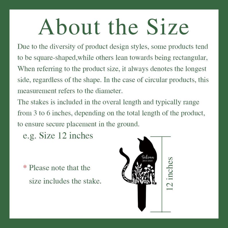 â The size refers to the longest side of the product, with the shorter side varying depending on the design. If the longest side is the height, the measurement includes the height of the stake.