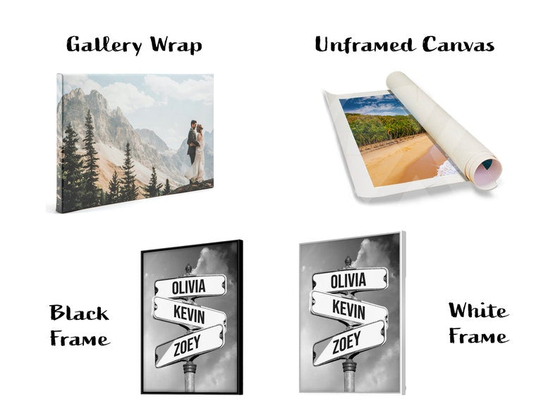 Gallery Wrapped Canvas: Our most popular option, featuring a printed and framed canvas, ready to hang.