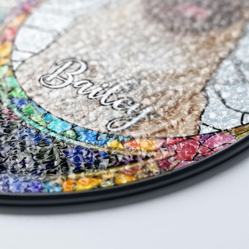 Cherish the memory of your beloved pet with our beautifully crafted stained glass artwork. Handcrafted by skilled artisans, each piece is uniquely designed to capture the essence of your furry friend. Using the photos you provide, we create a stunning portrait of your "partner" and print it onto the glass without the use of soldering. The result is a captivating work of art, with intricate details and vibrant colors that will leave a lasting impression.